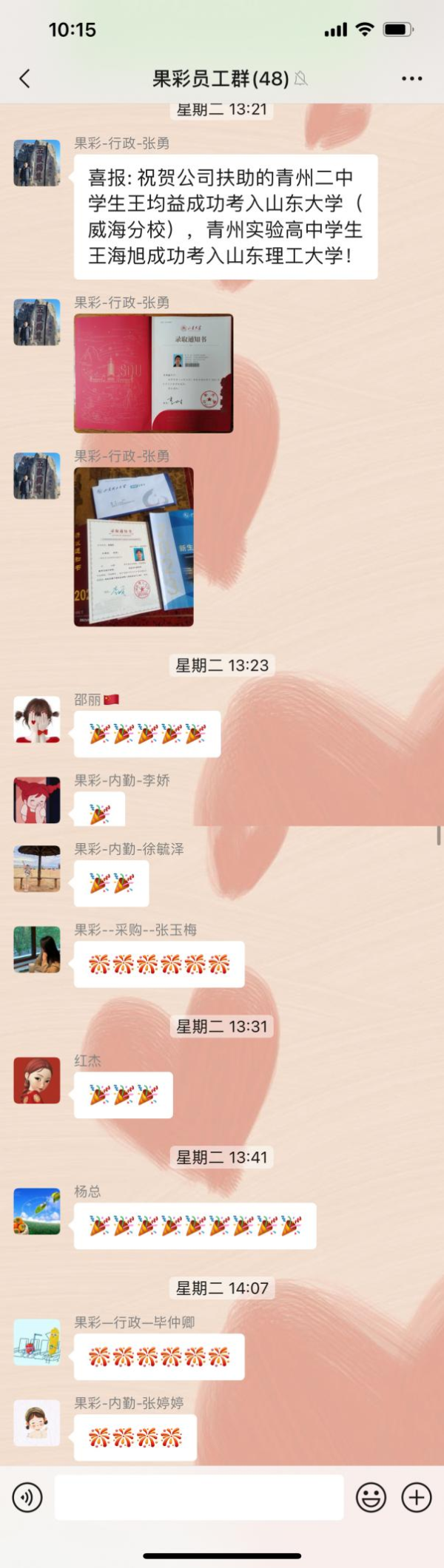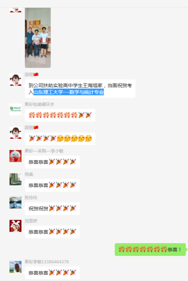 恭贺山东果彩包装材料有限公司扶助的王均益、王海旭同学,分别考上山东大学--数学学科、山东理工大学---数学与统计学科!果彩人员向他们当面表达了祝贺之情!